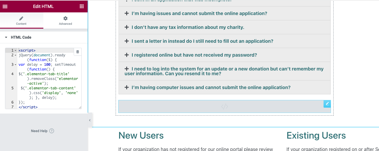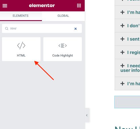 You can use the HTML widget to add the code above to your Accordion widget. Drag the HTML widget and place it right above the Accordion widget. Paste the code into the HTML Code field on the settings panel once the HTML widget is added.