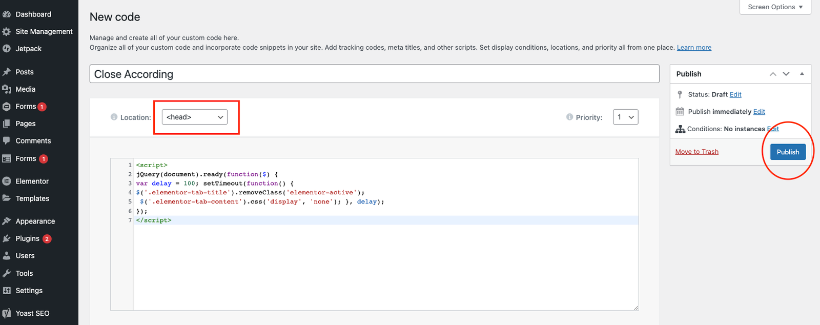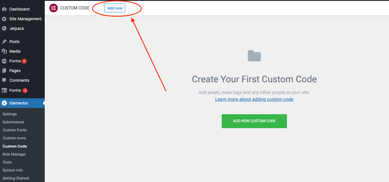 You can use a custom code option to make them all closed by default if you have multiple accordions on your website. Go to Elementor -> Custom Code on your WordPress dashboard to do so. Click the Add new button to add a new customs code.
